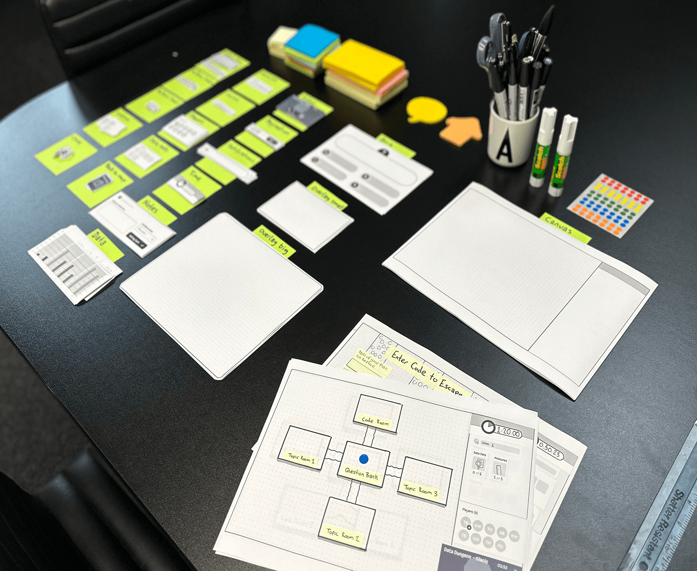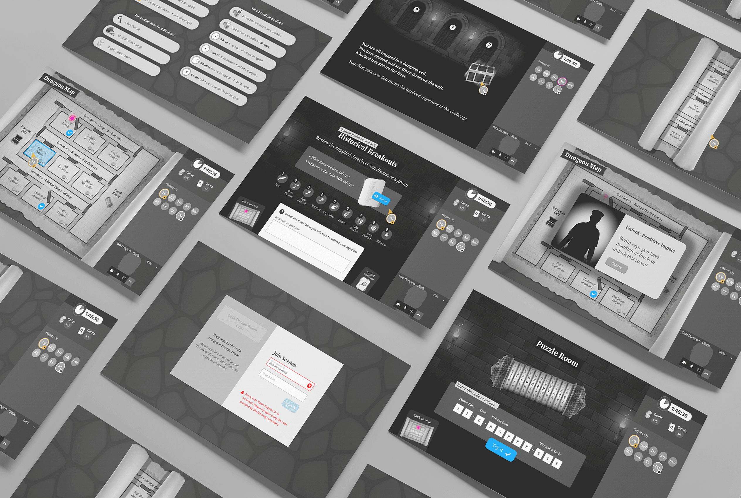 Drawing inspiration from physical escape rooms, I created mood boards to establish the visual themes and secure buy-in on the art direction. I then developed low-fidelity wireframes to outline the full user experience.
