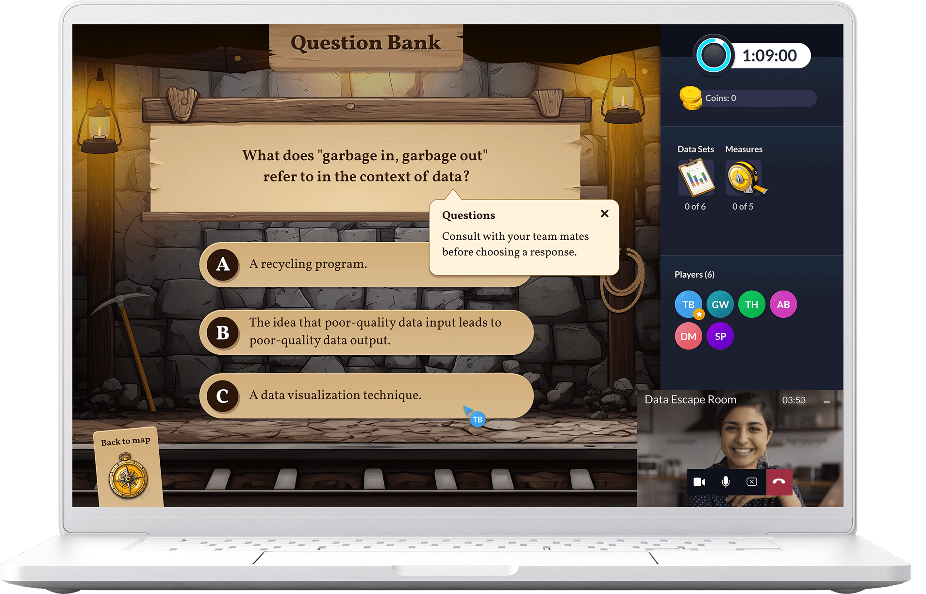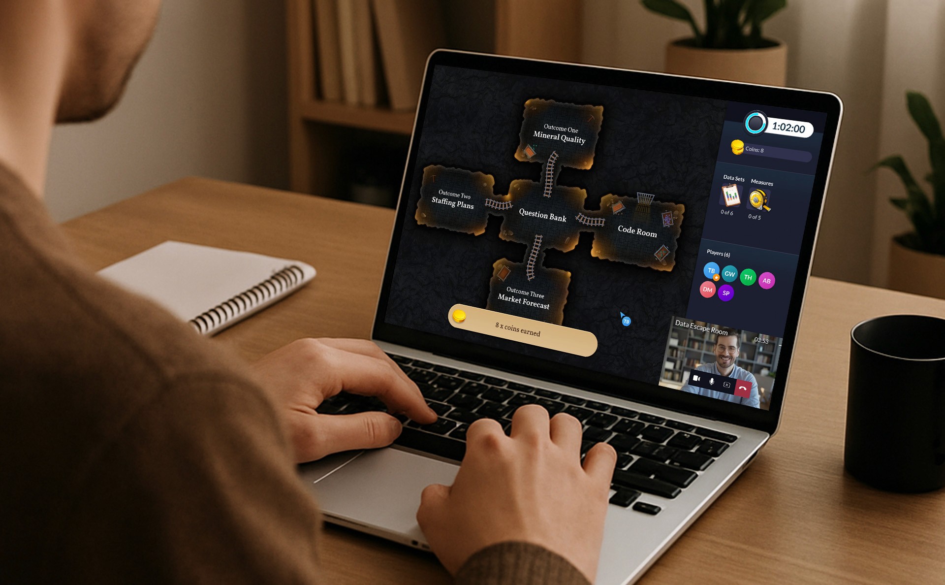 We created a one-hour multiplayer game where participants solve data-driven challenges to escape themed virtual environments. Blending data concepts with collaborative gameplay, the experience builds confidence in areas like data quality, ethics, bias and decision-making. A live facilitator tracks progress and leads a post-game debrief based on real-time analytics.