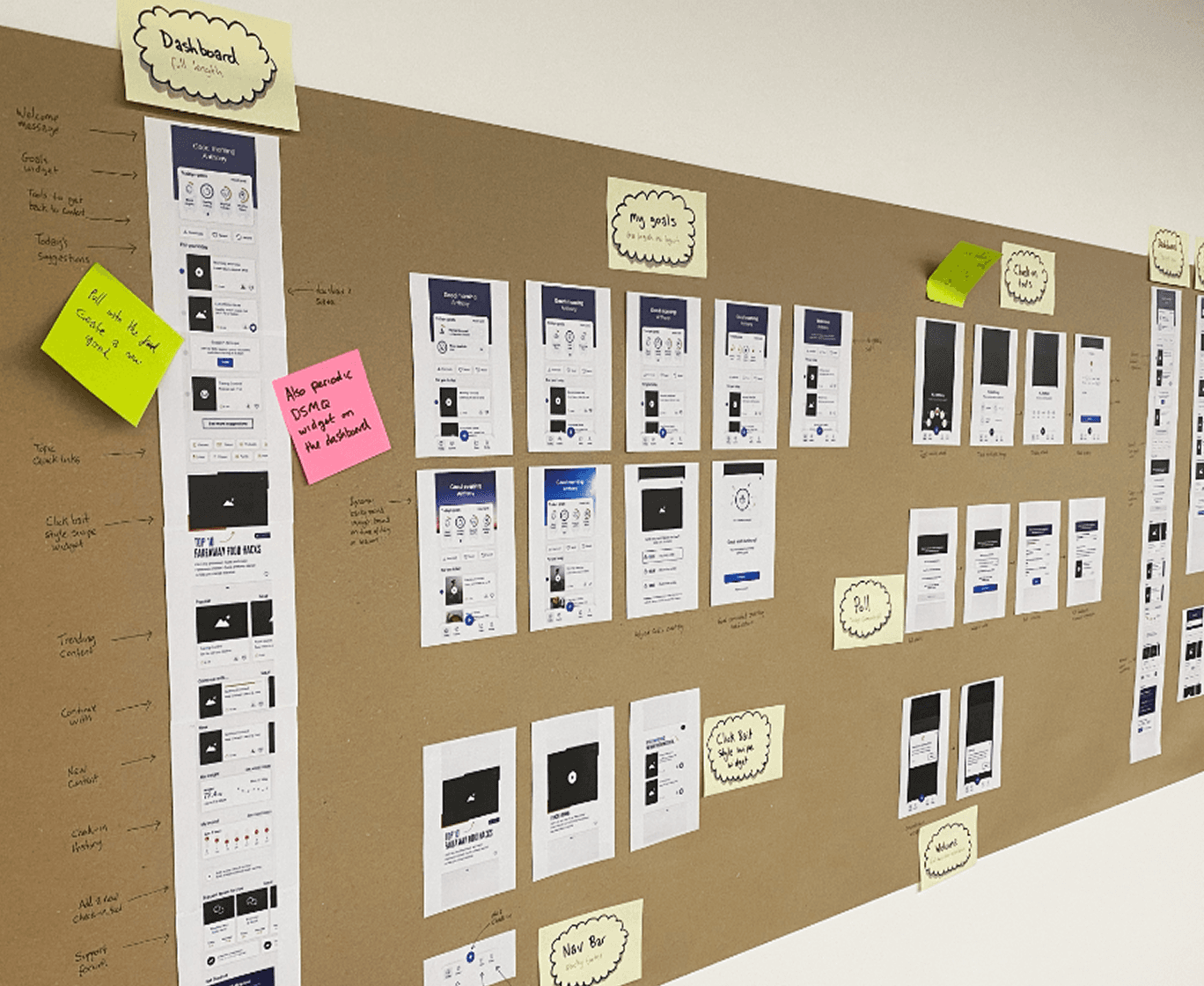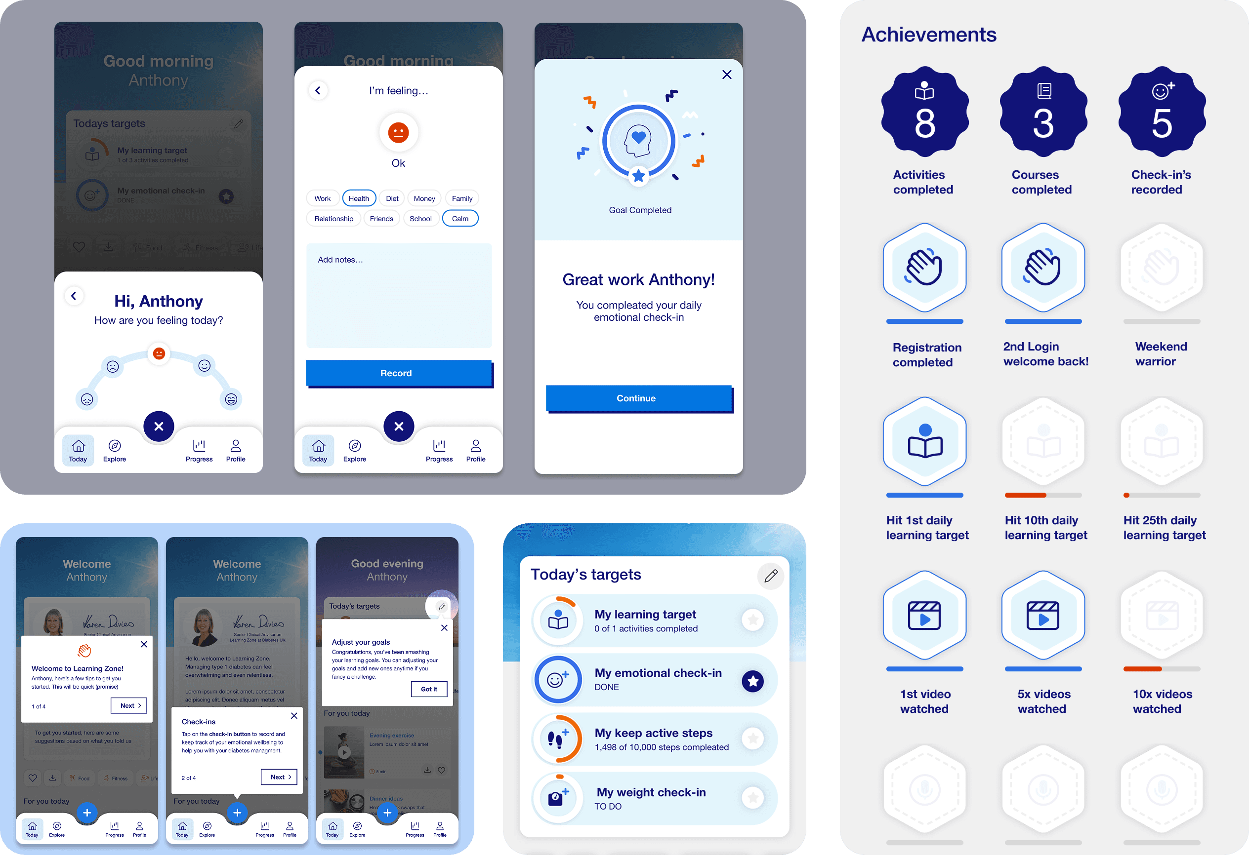 Using insights from the first workshop, I created low-fidelity wireframes exploring key concepts such as onboarding, dashboards, and goal-driven content. These were refined collaboratively in a second workshop and evolved into a mid-fidelity interactive prototype that could be tested with real users.
