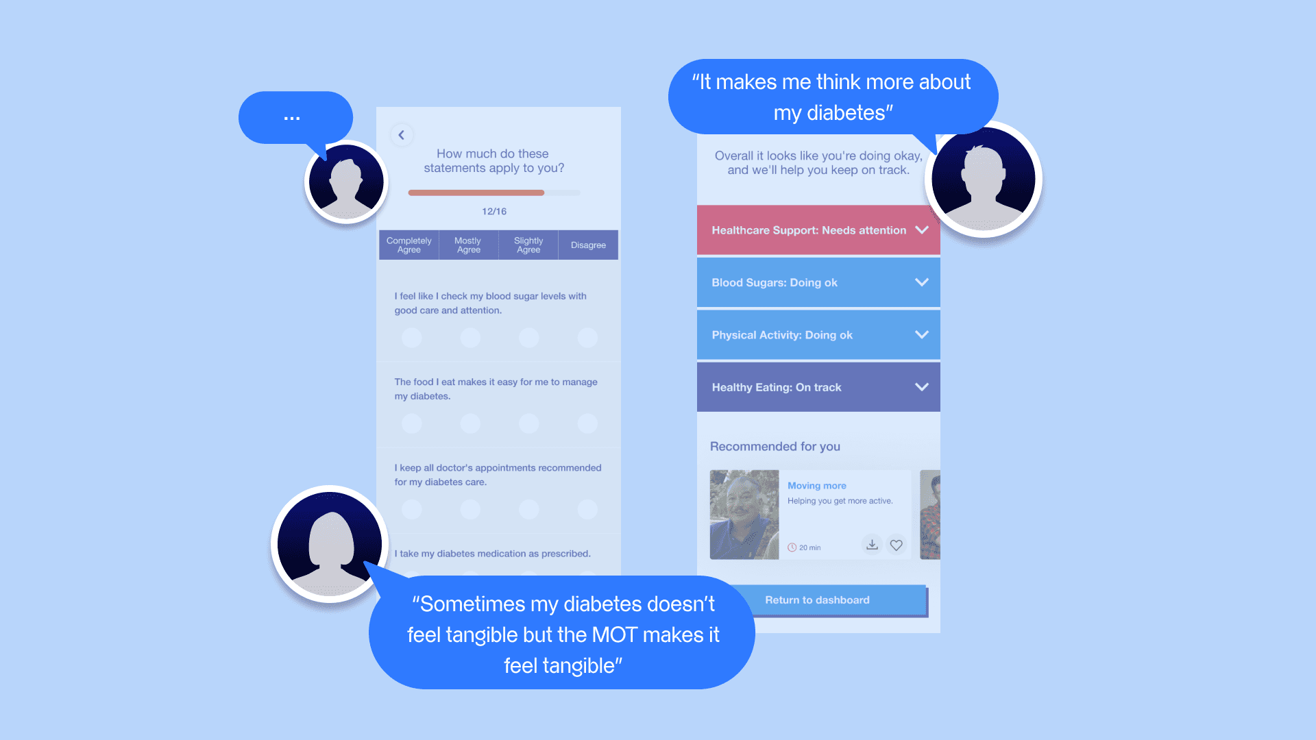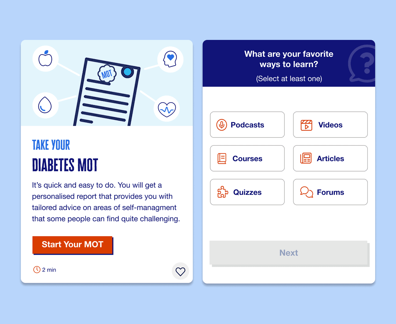 MOT Check-Up Quiz: An assessment feature that provides users with feedback on their self-management practices, followed by tailored content suggestions to support their needs.