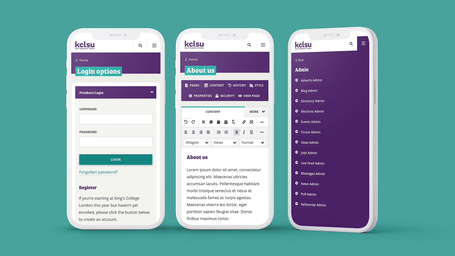 Additionally, I designed an intuitive CMS admin interface with a WYSIWYG editor, enabling KCLSU’s content team to easily update content without technical support.