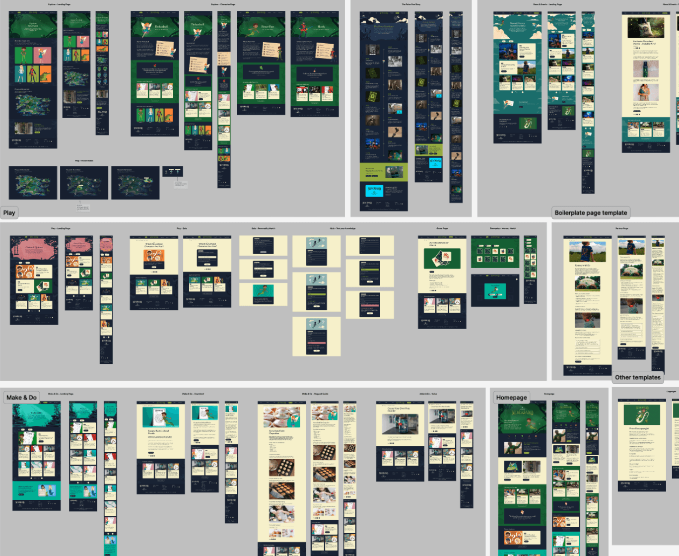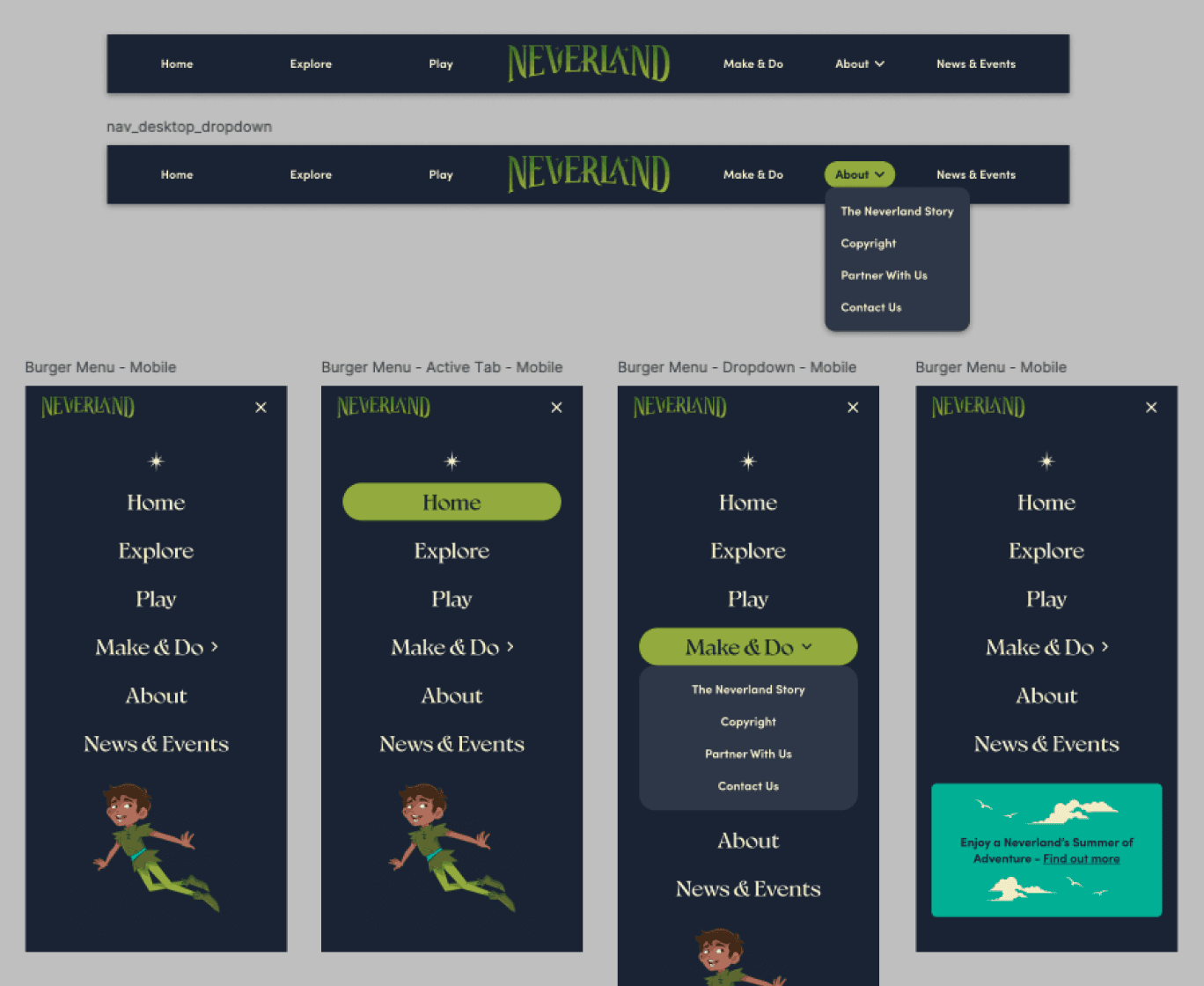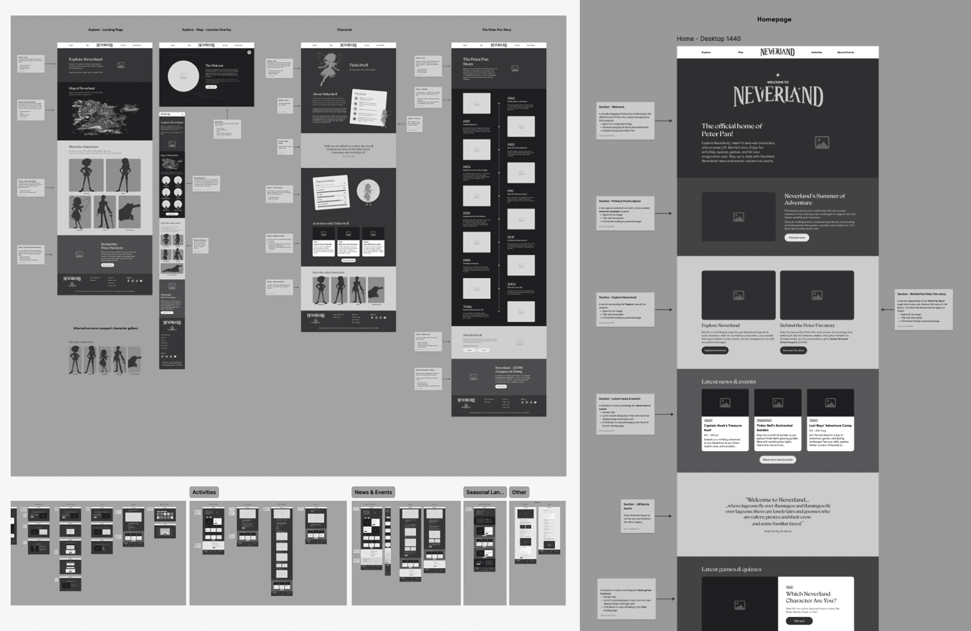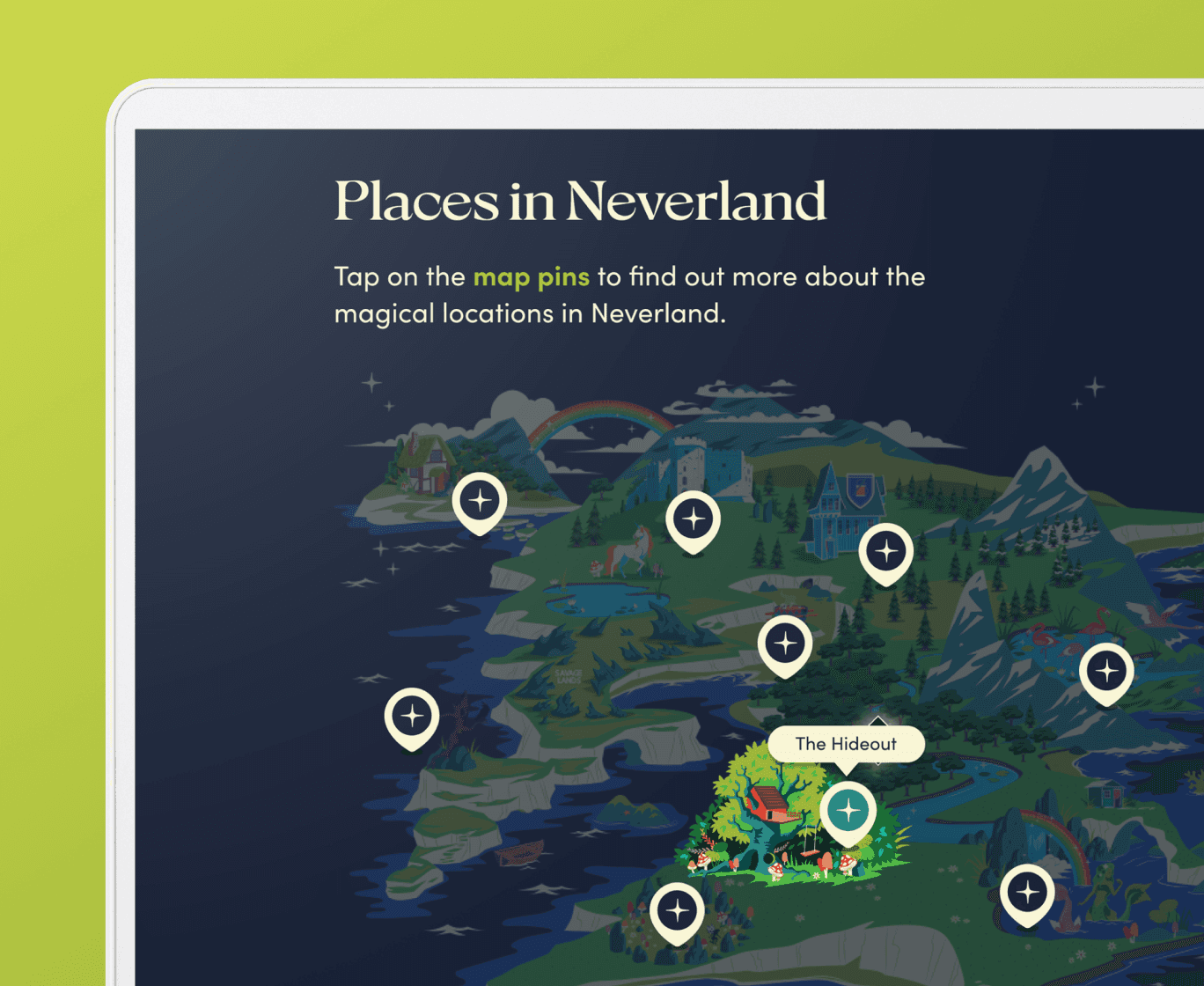 Each page was designed across desktop, tablet, and mobile, featuring animated characters, interactive maps, rich backgrounds, and quotes from Peter Pan to ground the experience in story.