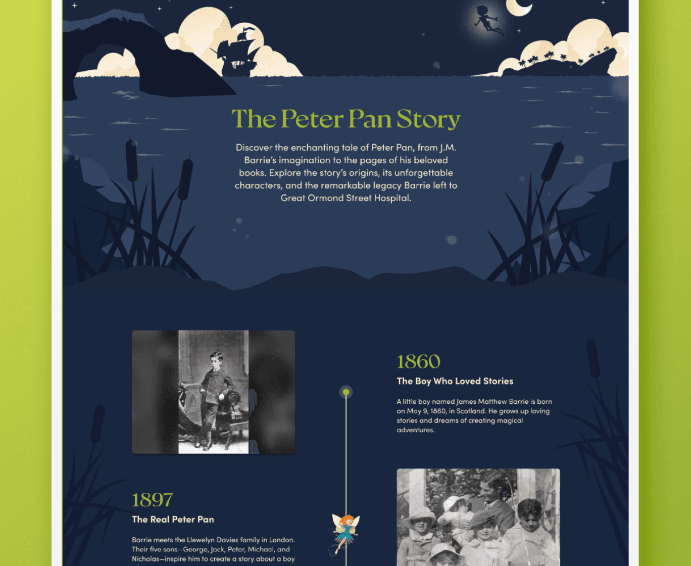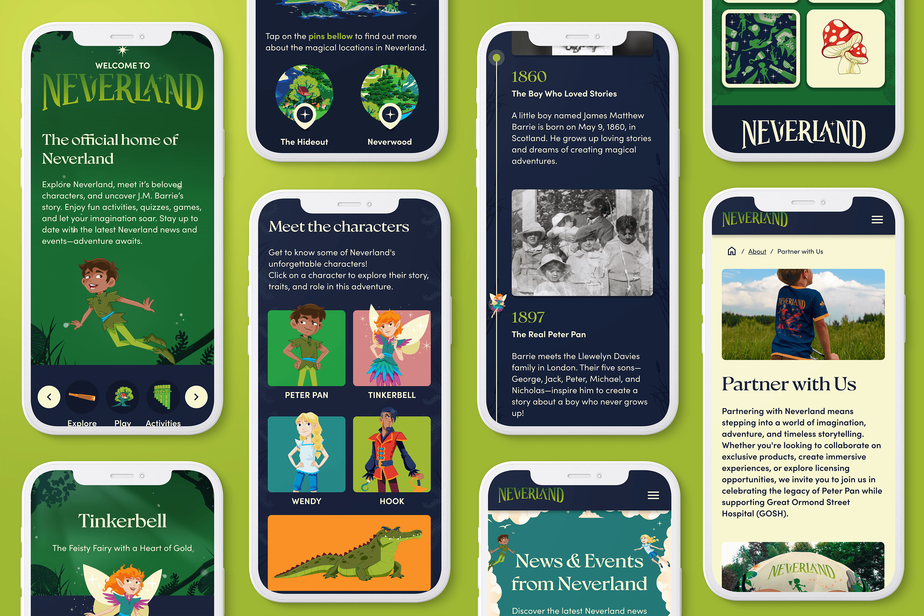 We created a magical website to launch GOSH’s new Neverland brand. Designed to engage children, inform parents and inspire commercial partners, while supporting GOSH’s mission to fund life-changing care and research. The new brand is rooted in the legacy of Peter Pan, whose author J.M. Barrie gifted the rights to Great Ormond Street Hospital in 1929.