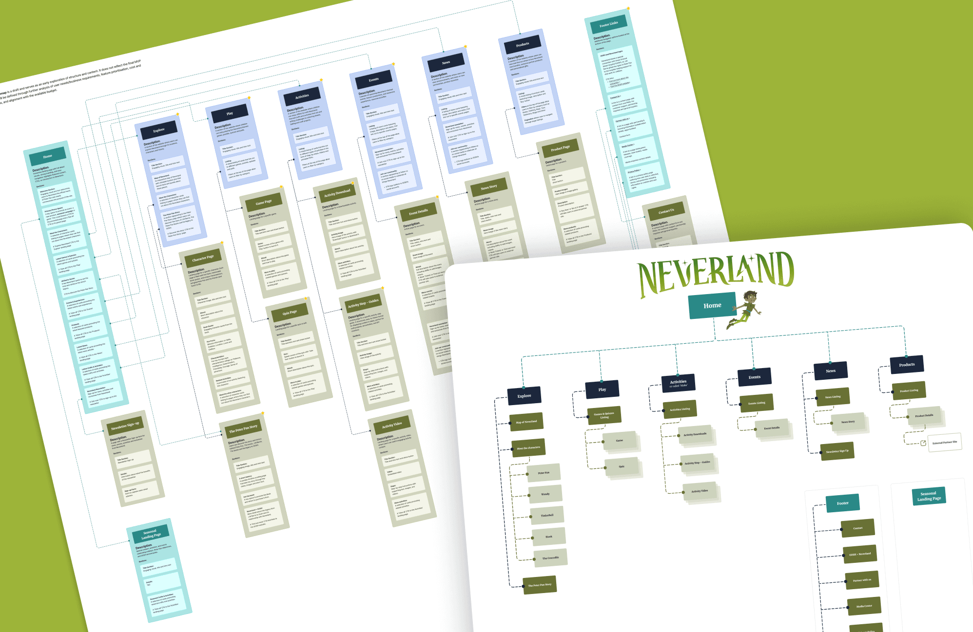 I produced a modular sitemap and clear information architecture, designed to grow with the brand. The structure separates content for kids and adults, balancing playful storytelling with practical needs—making it easy to explore Neverland’s characters and activities while also supporting events, partnerships, and GOSH’s wider mission.