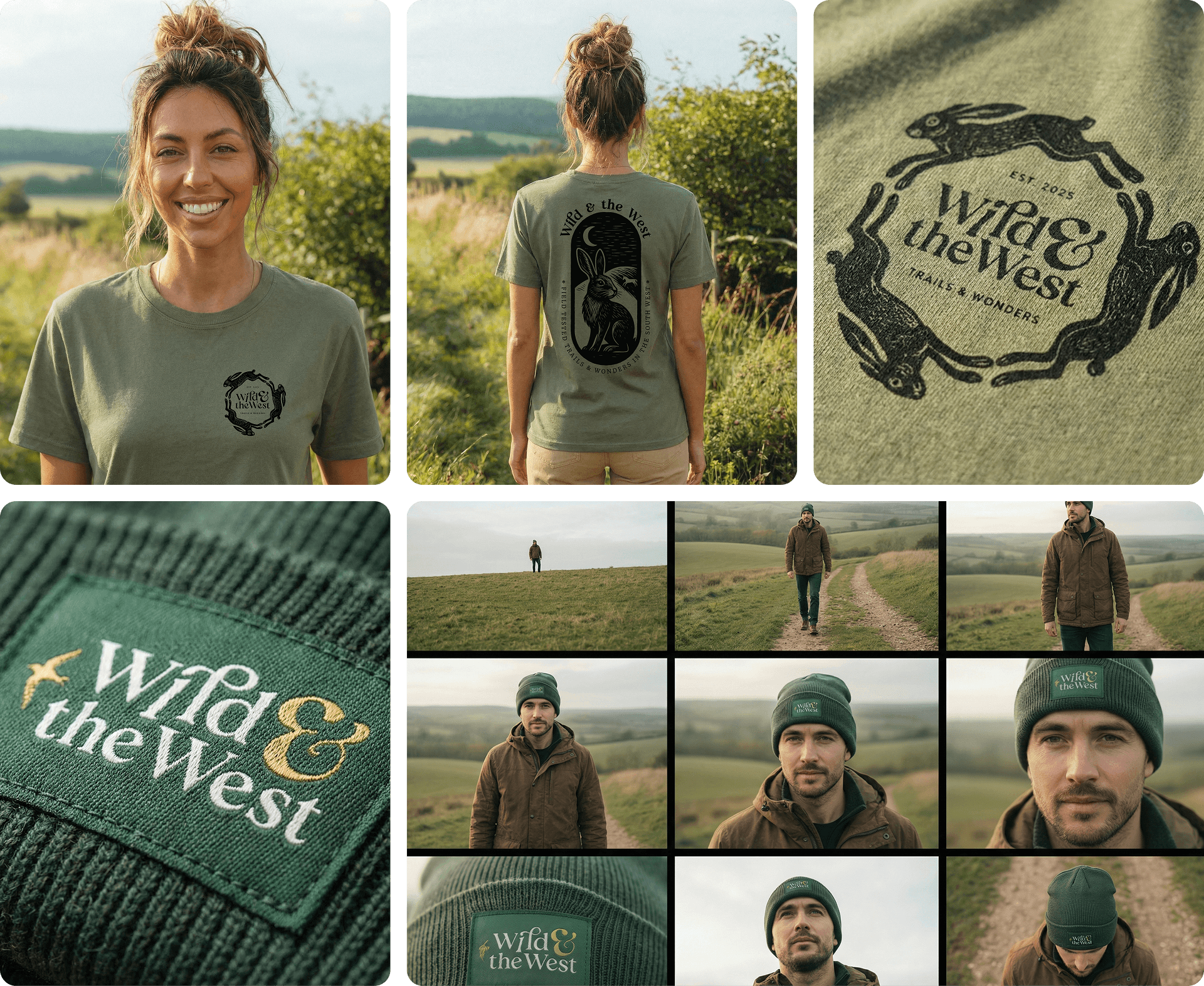 To extend the brand beyond screen, I developed a range of branded products and clothing. I explored virtual fashion photography as an alternative to traditional shoots, developing AI generated models and consistent character sheets to ensure visual continuity. This allowed me to produce realistic lifestyle imagery and video set within West Country inspired locations, while retaining full creative control.